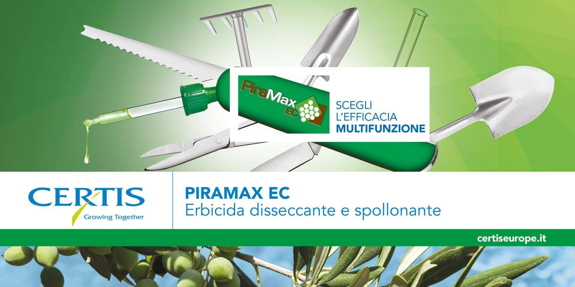 Al fine di eliminare tali problemi Certis Europe ha sviluppato Piramax® EC, autentico specialista sia nei diserbi sia nella spollonatura, pratica questa che appare fondamentale soprattutto su olivo e nocciolo, potendo essere inoltre utilizzato con profitto anche come disseccante pre-raccolta della patata. Il prodotto è formulato come emulsione concentrata a base di pyraflufen ethyl in ragione di 26,5 grammi per litro ed esplica la propria azione esclusivamente per contatto. Ciò comporta un rapido disseccamento delle superfici raggiunte direttamente dal trattamento, arrestando in tal modo l’azione competitiva nel più breve tempo possibile.