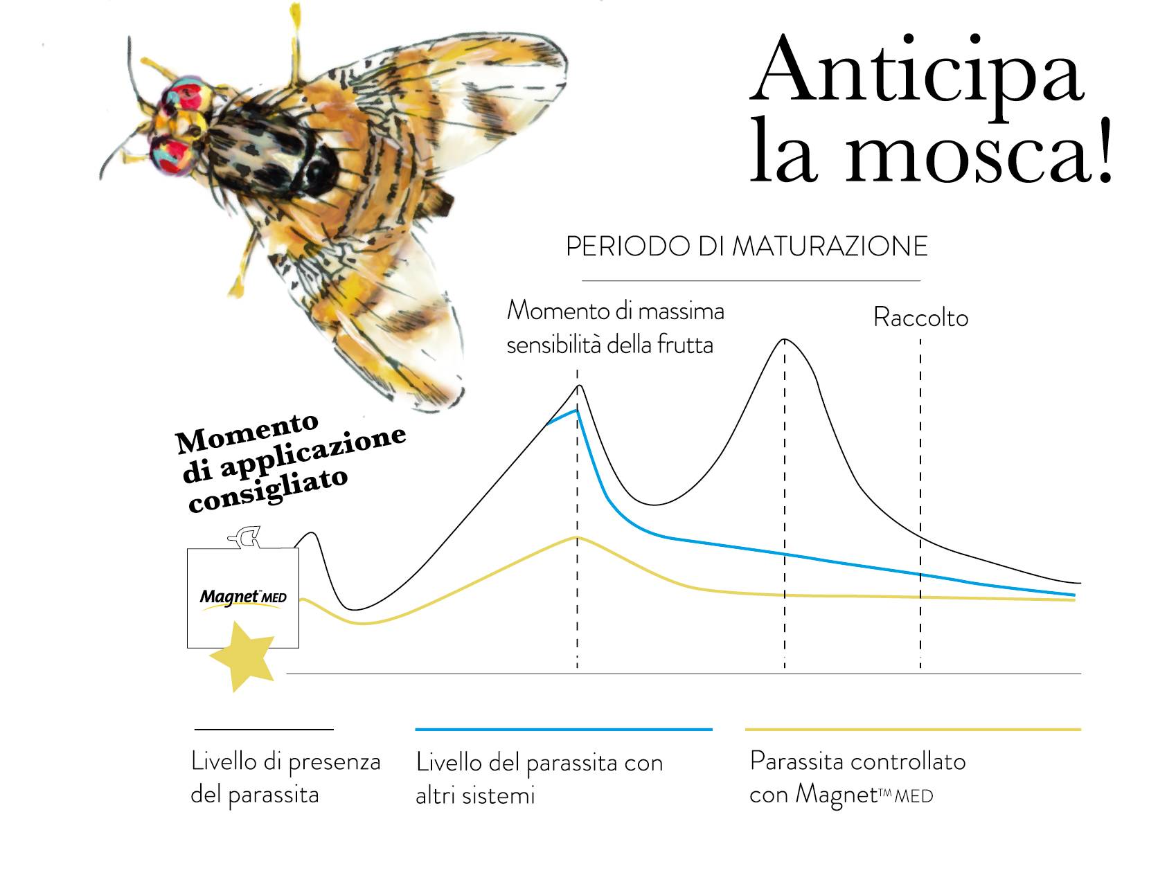 Magnet™ MED garantisce la sua massima efficacia per almeno 6 mesi ed è progettato per essere installato in maniera preventiva, precedentemente al momento di massima sensibilità della frutta all’attacco della mosca, difendendo l’intero raccolto.