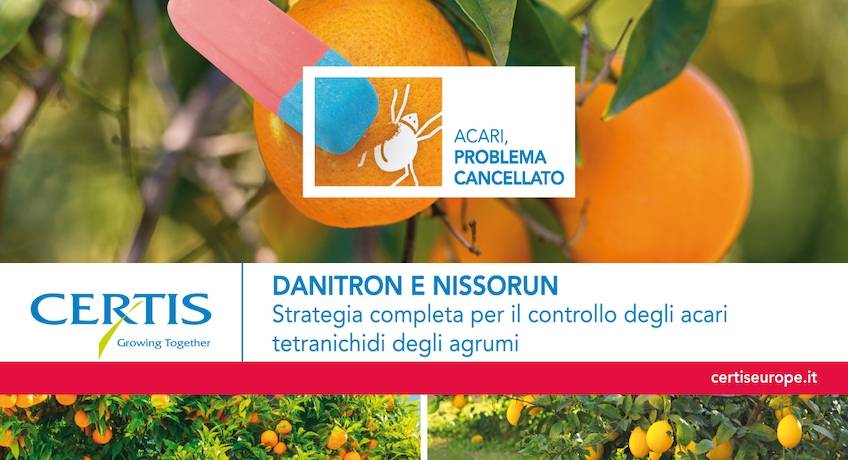 Danitron® e Nissorun® sono i due acaricidi proposti da Certis Europe per il controllo degli acari tetranichidi che infestano gli agrumi. Il primo è formulato come sospensione concentrata e appartiene alla famiglia chimica dei fenossipirazoli contenendo fenpiroximate, il quale inibisce i processi di respirazione mitocondriale e pertanto è stato classificato da IRAC in gruppo 21A.