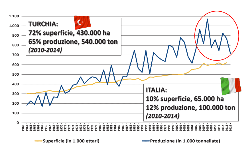 La Fig. 1, ricavata da dati FAO, mostra i trend di superfici produttive e produzioni tra Turchia ed Italia.