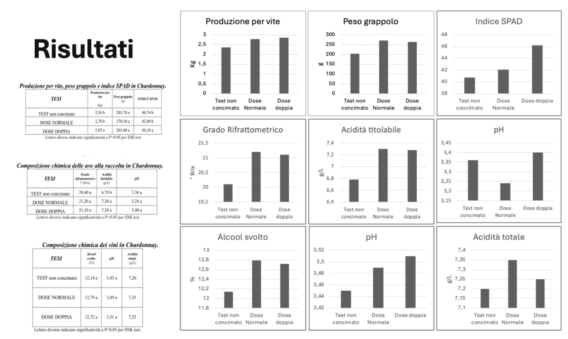 Alla vendemmia, le uve presentavano la stessa composizione chimica senza differenze in termini di contenuto zuccherino e pH, mentre è stato notato un incremento di acidità titolabile nei trattamenti D1 e D2. Vini sottoposti a trattamenti diversi hanno mostrato parametri chimici simili (grado alcolico, acidità titolabile e pH).