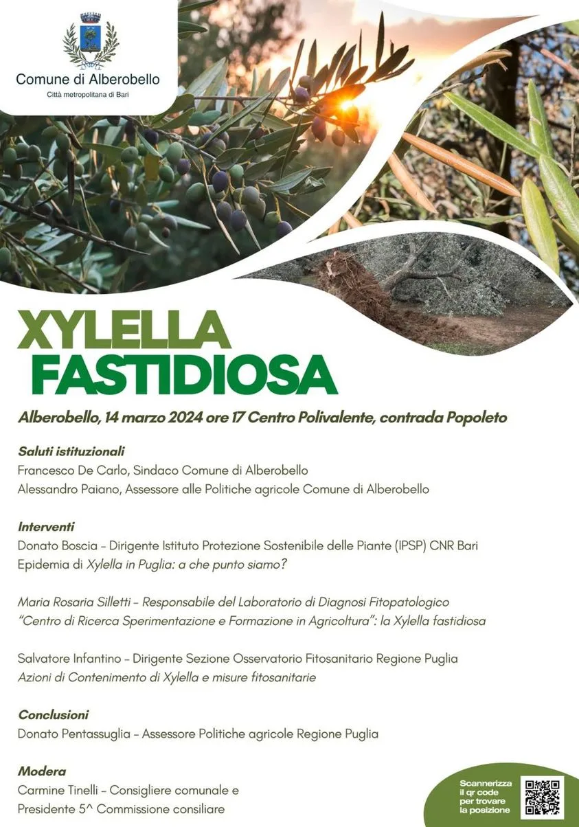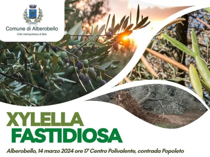 ‘Xylella Fastidiosa’. Questo è il tema dell’incontro previsto per domani, giovedì 14 marzo alle 17 presso il Centro Polivalente, in contrada Popoleto ad Alberobello.