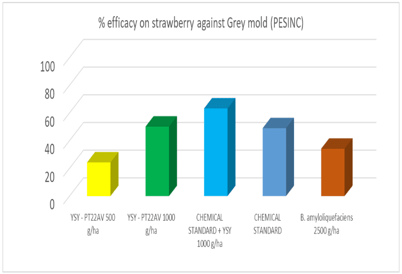 Alla valutazione finale, il 47,8% dei frutti negli appezzamenti non trattati erano infetti da B. cinerea. Otto applicazioni di YSY-PT22AV a 1 kg/ha hanno ottenuto un’efficacia maggiore rispetto al riferimento organico di B. amyloliquefaciens a 2500 g/ha per 10 applicazioni. PT22AV ha mostrato un’efficacia equivalente di due applicazioni dello standard chimico (Ciprodinil+Fludioxonil 800 g/ha) alla velocità di etichetta. La strategia con 6 applicazioni di PT22AV a 1 kg/ha combinata con una applicazione di standard chimico a 800 g/ha ha fornito il miglior controllo contro la muffa grigia.