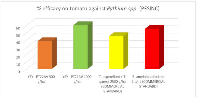 YSY-PT22AV a 1 kg/ha applicato sei volte a settimana dal trapianto, ha ottenuto la migliore efficacia contro Pythium spp., comparabile o superiore B. amyloliquefaciens a 3 L/ha per otto applicazioni e Thricoderma asperellum – Thricoderma gamsii a 2500 g/ha per due applicazioni.