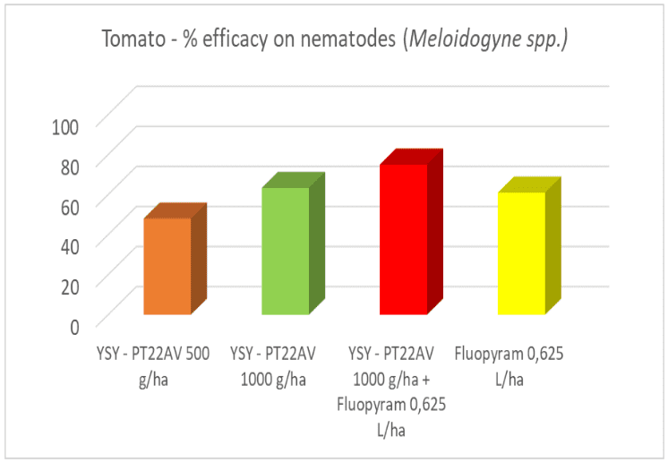 Alla valutazione finale, il 60% delle piante degli appezzamenti non trattati erano infette da nematodi. Otto applicazioni di YSY-PT22AV ad alte dosi (1 kg/ha) hanno raggiunto un’efficacia nematocida soddisfacente ed erano equivalenti a due applicazioni dello standard chimico Fluopyram alla dose indicata in etichetta. 4 applicazioni di PT22AV ad alte dosi (1 kg/ha) combinate con due applicazioni di Fluopyram hanno fornito il miglior controllo dei nematodi. L’effetto biostimolante di YSY-PT22AV ha aumentato la resa commerciale di quasi il 20% rispetto allo standard di riferimento.