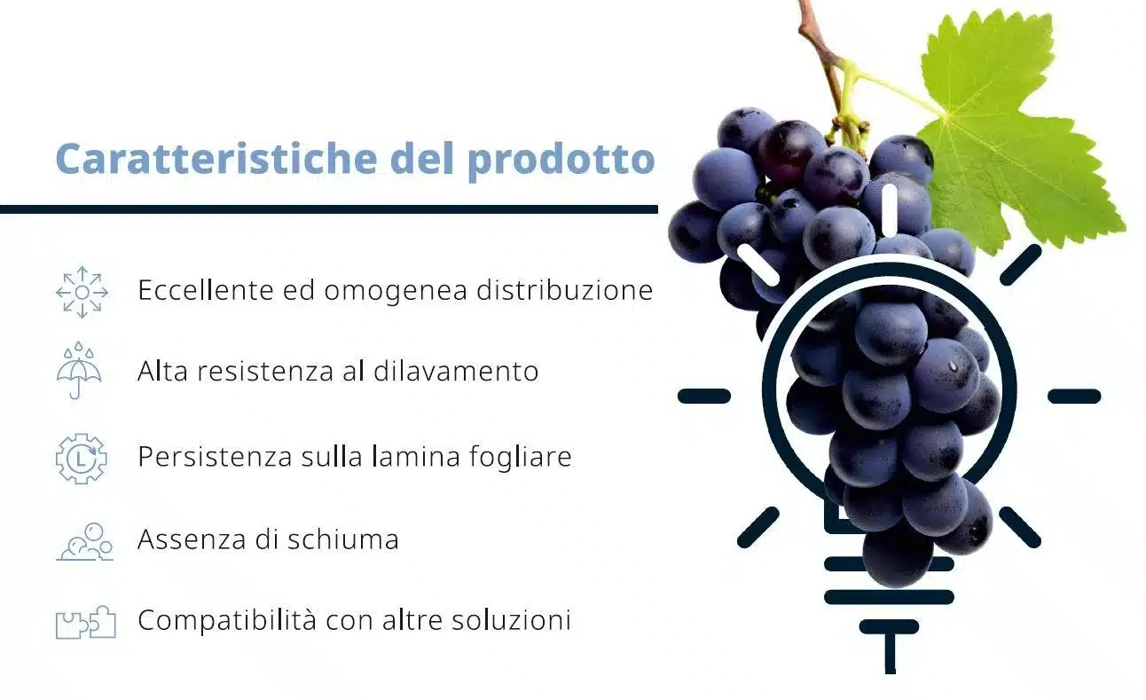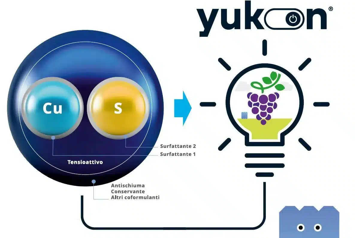 L’innovativa formulazione in sospensione acquosa concentrata di YUKON® contiene 80 g/L di rame da solfato tribasico (brochantite) e 640 g/L di zolfo. Questo sistema unico ottimizza l’effetto sinergico tra le due sostanze attive, massimizzando l’efficienza ed efficacia del prodotto. La “brochantite” permette una “cessione controllata” degli ioni rame, mentre lo zolfo sublima in modo costante nel tempo. Inoltre, l’uso di coadiuvanti selezionati garantisce un’eccellente distribuzione sulla vegetazione e un’ottima resistenza al dilavamento.