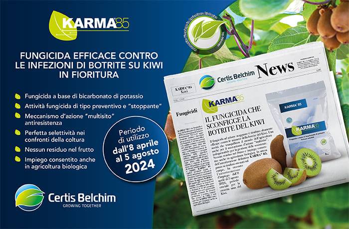 Certis Belchim B.V. propone il formulato commerciale Karma 85 come alleato vincente per il controllo della botrite del kiwi in fioritura. Karma 85 ha infatti ottenuto l’autorizzazione all’impiego per emergenza fitosanitaria per il controllo della botrite in fioritura, con una finestra di impiego a partire dall’ 8 aprile 2024 al 5 agosto 2024, coprendo in tal modo le fasi fenologiche più sensibili per la coltura.