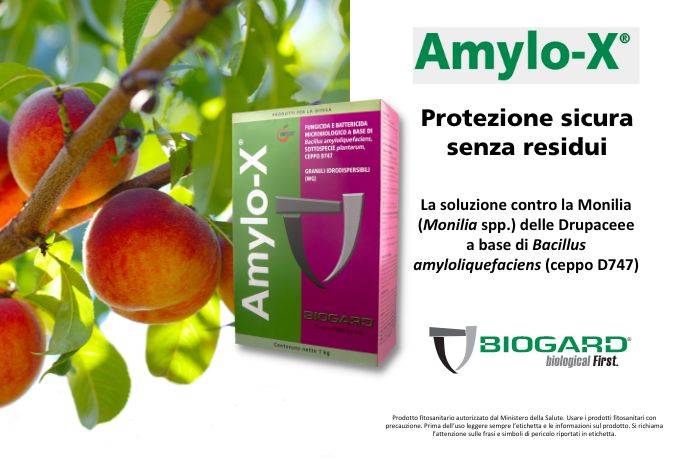 Monilia e batteriosi delle drupacee: Amylo-X è la proposta Biogard. Amylo-X è un fungicida e battericida microbiologico a base del batterio Bacillus amyloliquefaciens, subspecie plantarum (ceppo D747). Il prodotto formulato contiene ben 5×1010 CFU/grammo di prodotto; tale elevata concentrazione e le sue caratteristiche genetiche gli consentono di possedere un ampio spettro d’azione.