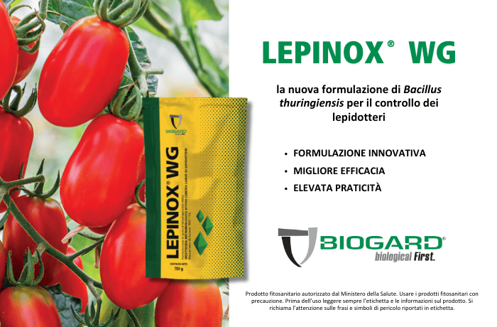 Lepinox® WG è il nuovo insetticida microbiologico a base di Bacillus thuringiensis subsp. kurstaki (ceppo EG 2348), sviluppato da Biogard – Divisione di CBC Europe per garantire un controllo efficace, sicuro e sostenibile delle larve di lepidotteri nelle principali colture orticole, frutticole e industriali.