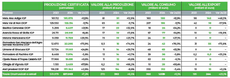 La categoria ortofrutticoli e cereali conta 128 denominazioni DOP e IGP e rappresenta il 4,1% del valore alla produzione del comparto delle Indicazioni Geografiche agroalimentari e il 4,7% del suo export.
