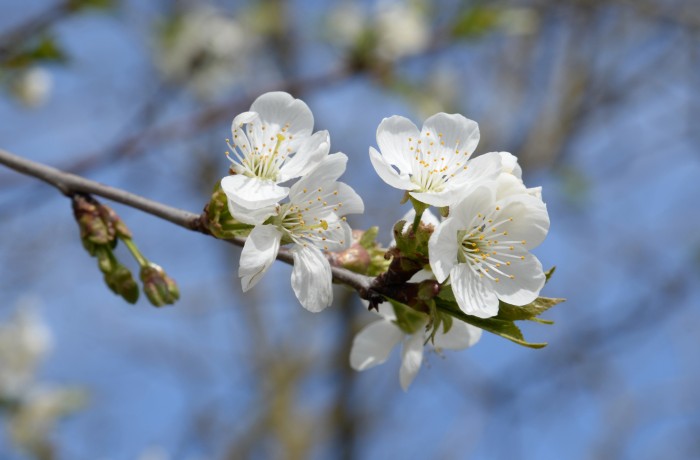Stadi fenologici del ciliegio dolce; (A) gemma dormiente, (B) gemma rigonfia, (C) punta verde, (D) mazzetto serrato, (E) bottone bianco, (F) inizio fioritura, (G) piena fioritura, (H) caduta dei petali.
